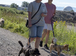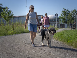 Um sich an die Gegenwart der anderen Hunde und Menschen zu gewöhnen, laufen alle Hunde an der der Leine mit angemessenem Abstand. Auch Begegnungsübungen werden immer wieder mit eingebaut.